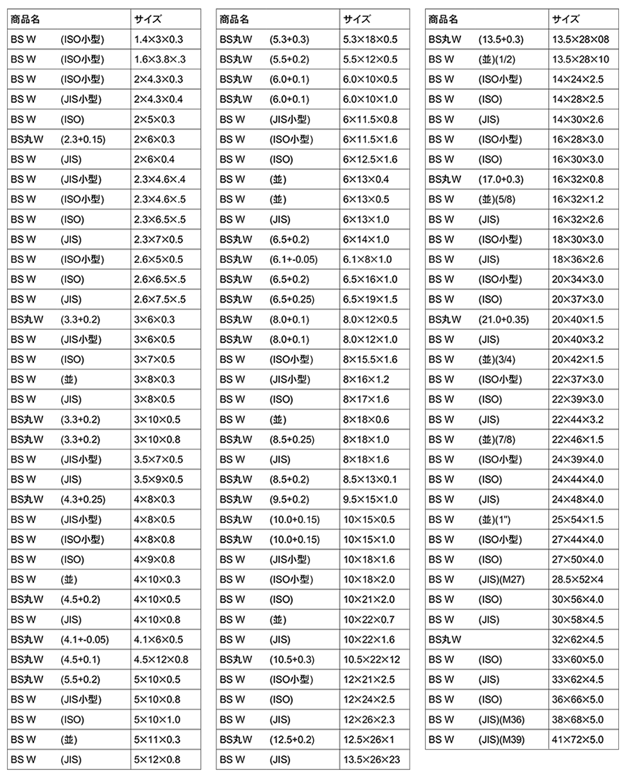 ねじのデータ集 > 真鍮座金 規格サイズ一覧表