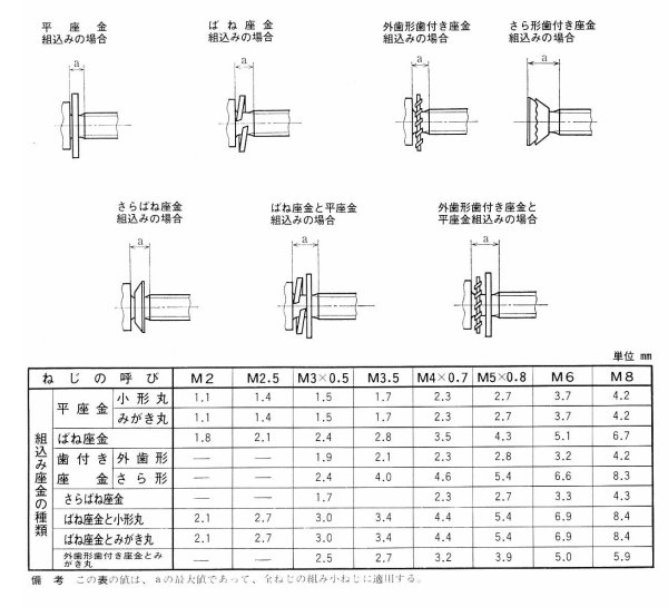 座金組込ねじの頭部座面下からの不完全ねじ部の寸法一覧となります。